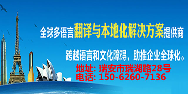 瑞安大邦翻译有限公司成立于2002年,是经瑞安工商行政管理部门批准登记注册的一家专业的瑞安翻译公司,我公司是瑞安第一家专业的翻译公司,公司旨在提供翻译服务。瑞安大邦翻译有限公司来自于省内外名校和研究所的专家学者,留学归国人士,译员在各自的语言翻译领域有丰富的翻译经验,可以向客户提供更加准确的翻译服务。瑞安大邦翻译有限公司拥有专业的翻译团队,具有二十四小时翻译服务能力,瑞安翻译公司的成功得来源于对翻译业的执着和拼搏,吸纳了翻译界的精髓和文化,在翻译和本地化服务等方面不断革新、锐意进取、积极探索,满足了不同行业、不同语种、不同层次的客户需求, 采用灵活的结算方式,减少往来手续,同时在公司内部,我们通过优化与整合内部资源,降低运作成本,提高我们的性价比和在行业中的竞争力,进一步降低服务价格,为客户提供最大限度的便利和优惠。
